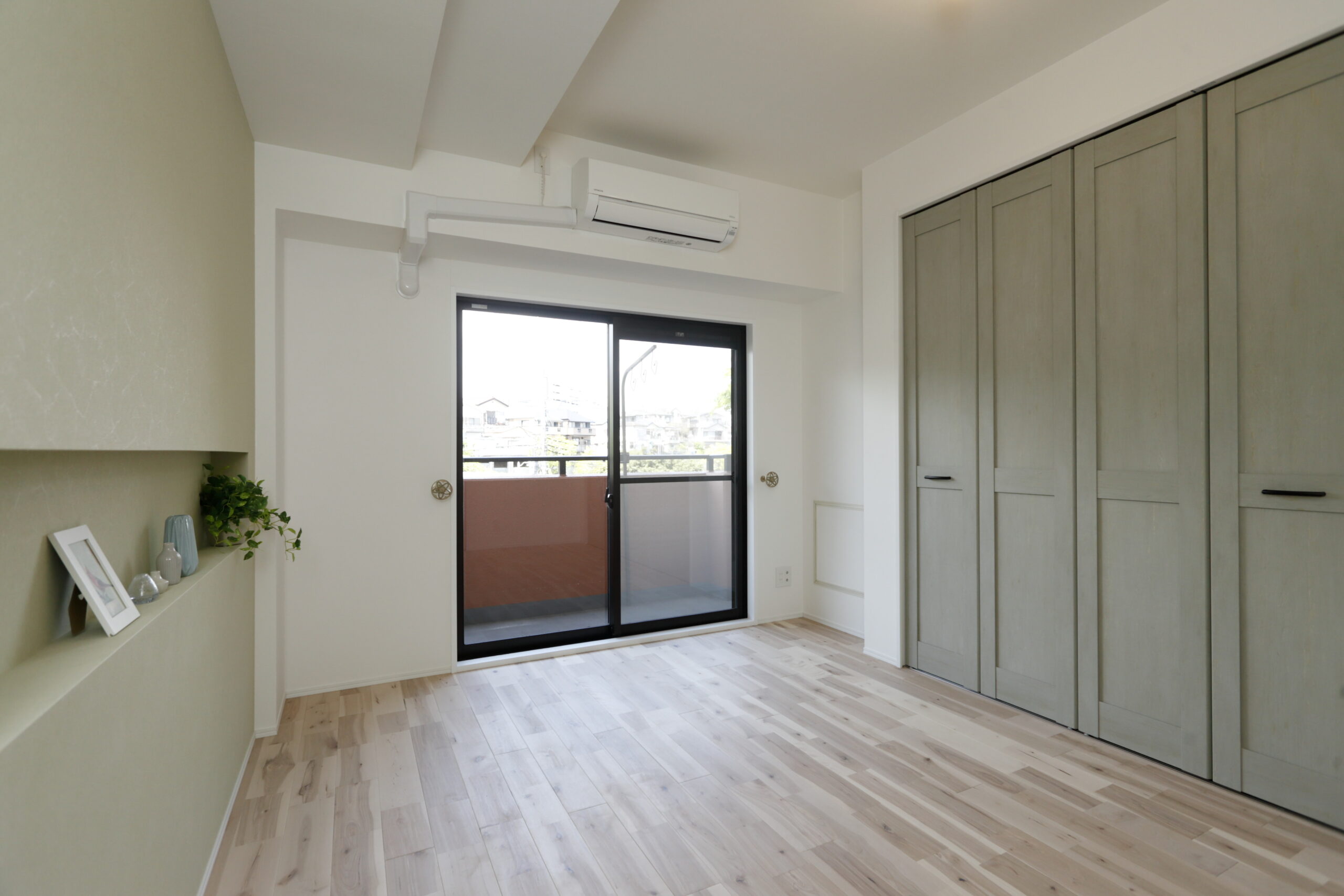 同じ自然素材の無垢フローリングを使用しながら、全く異なる空間にした寝室。